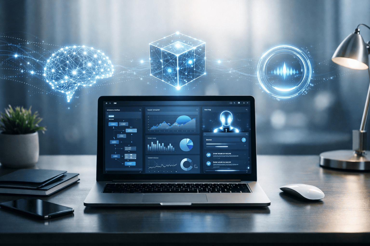 Ultra-realistic AI-powered productivity workspace with a laptop displaying AI dashboards, automation workflows, and data analytics in a modern office setup.