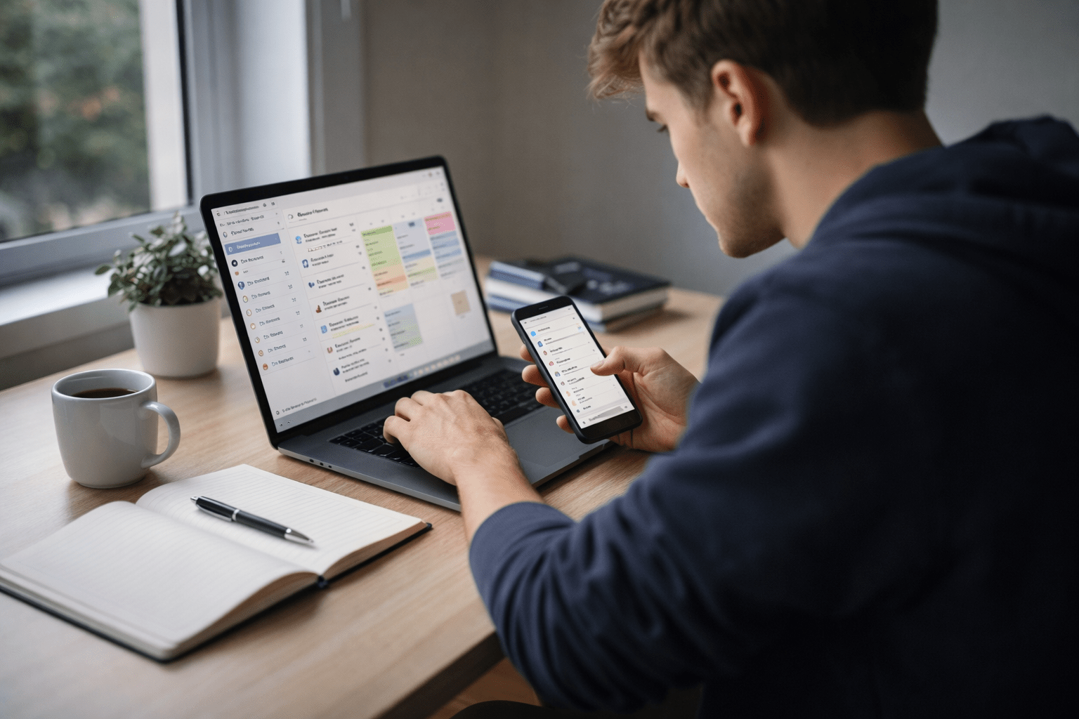 Student studying using productivity apps on laptop and smartphone in a modern workspace in 2025